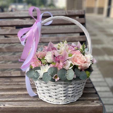 Корзина Ренессанс из эустомы, трахелиума, альстромерии, роз, антирриума и агапантуса