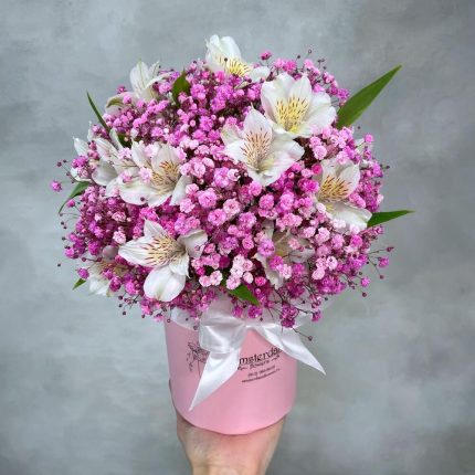 Авторский букет “Душистый горошек” с белой лилией, хлопком и лизиантусом