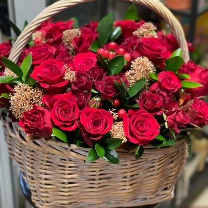 Корзина Прекрасная Иллюзия из роз сорта капучино, фридом, эустомы и кустовых роз