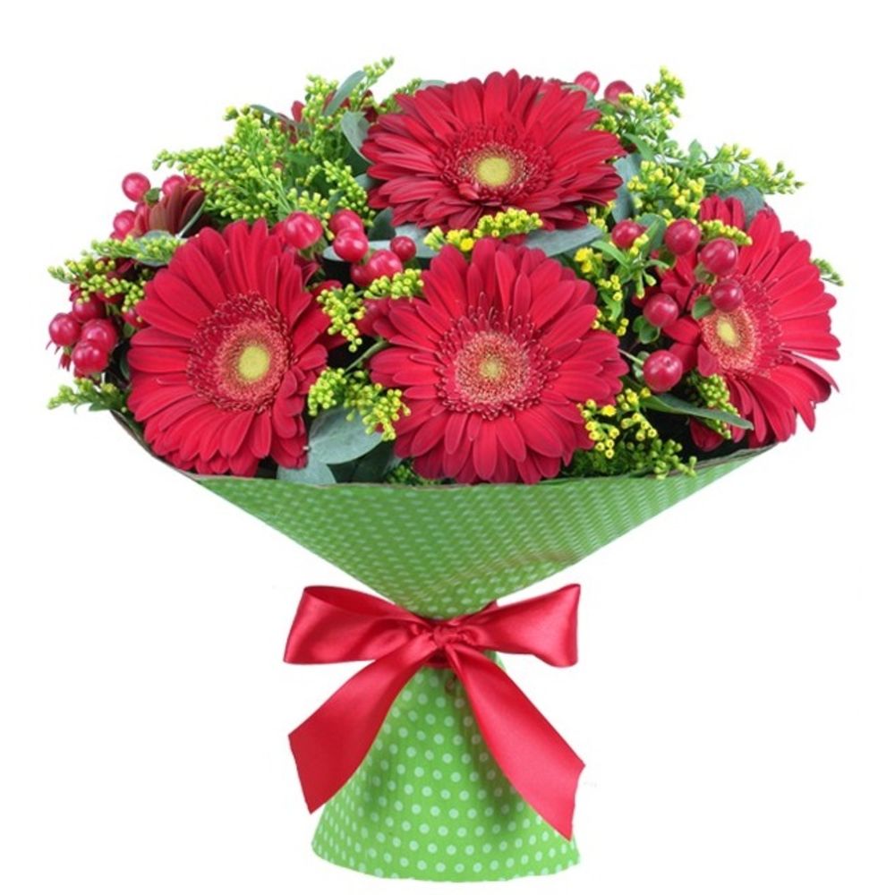 Солидаго – 1 шт.лента декоративная – 1 шт.Эвкалипт – 1 шт.Гиперикум красный – 7 шт.Гербера красная – 7 шт.