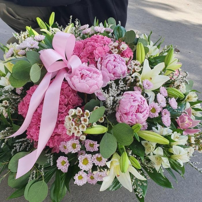 Корзина плетеная – 1 шт.Оазис флористический – 2 шт.Зелень – 15 шт.Рускус Италия – 1 шт.Гортензия – 2 шт.Пион Сара Бернар – 5 шт.Орхидея Цимбидиум – 3 шт.Сантини – 7 шт.Лимониум – 4 шт.Альстромерия – 8 шт.Эвкалипт – 3 шт.Лилия – 5 шт.Ваксфлауэр – 3 шт.