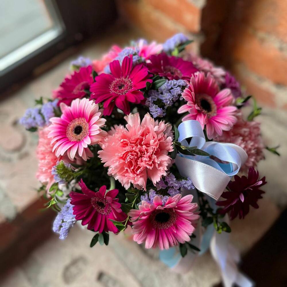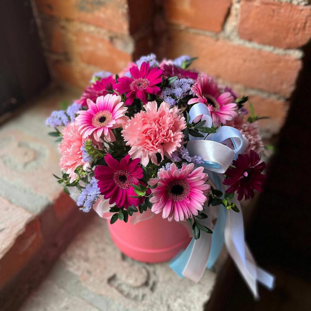 Букет из мини гербер, статицы и гвоздики в шляпной коробке “Сады Падишаха”