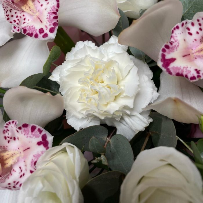 Белоснежная цветочная коробка с восхитительными орхидеями.