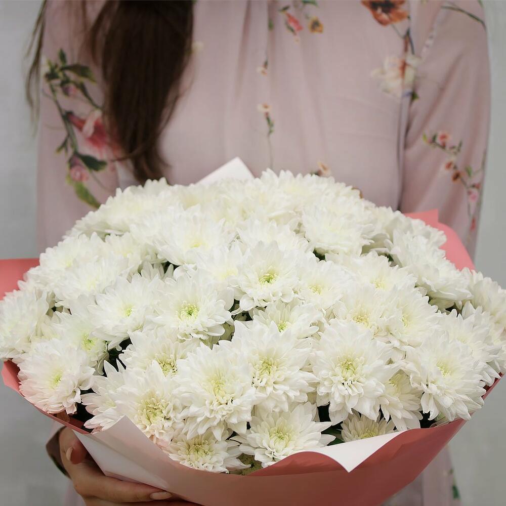 Букет из 15 белых кустовых хризантем Балтика в стильной упаковке