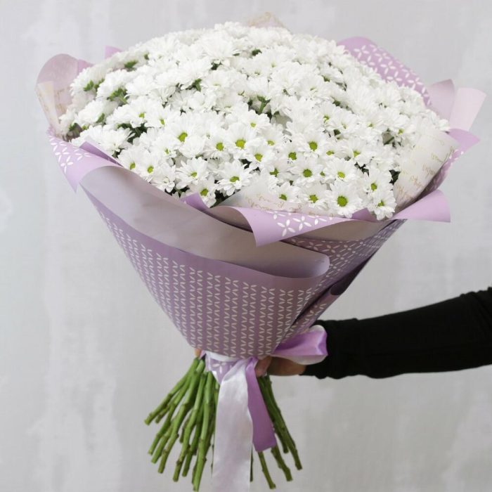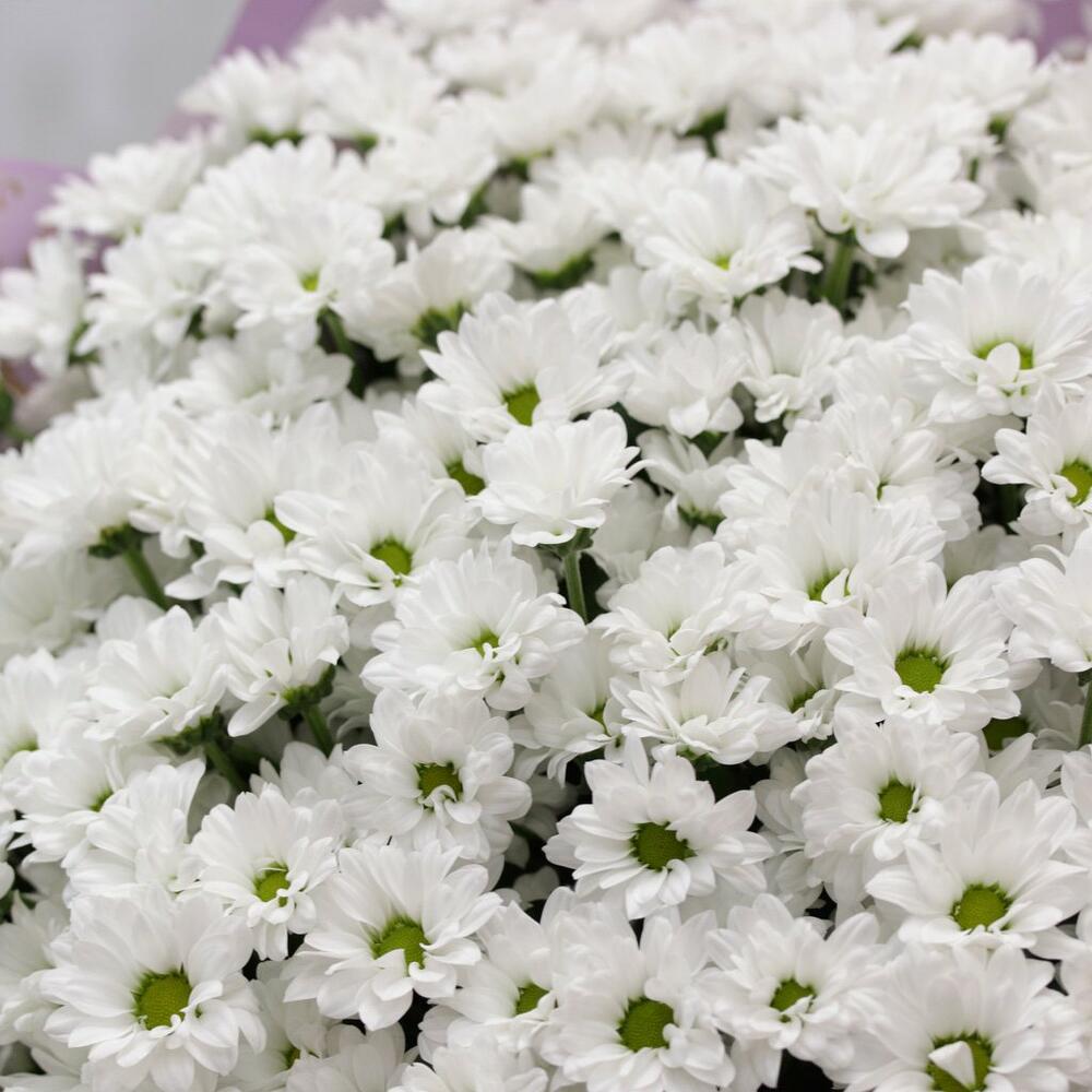 Букет из 49 белых кустовых хризантем Сантини в стильной упаковке