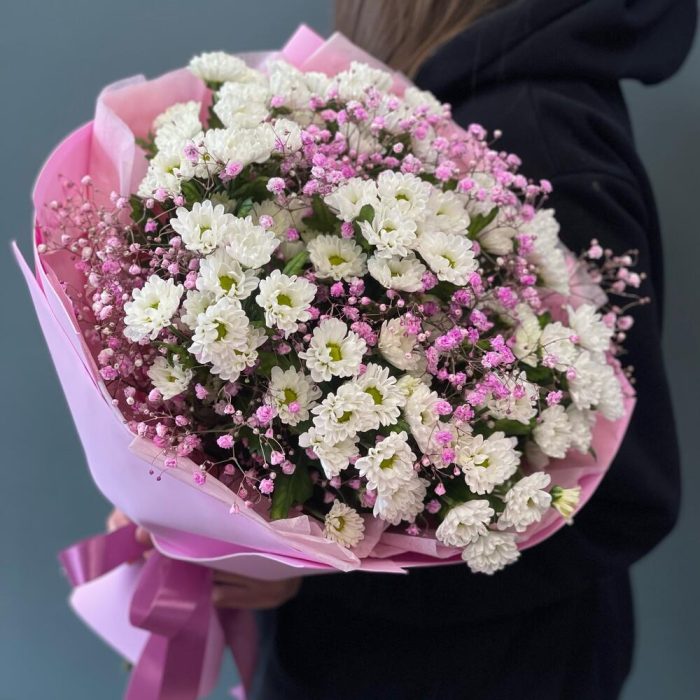 Гипсофила – 2 шт.Хризантема Сантини – 9 шт.Лента атласная – 1 шт.Тишью – 2 шт.Упаковка дизайнерская – 1 шт.