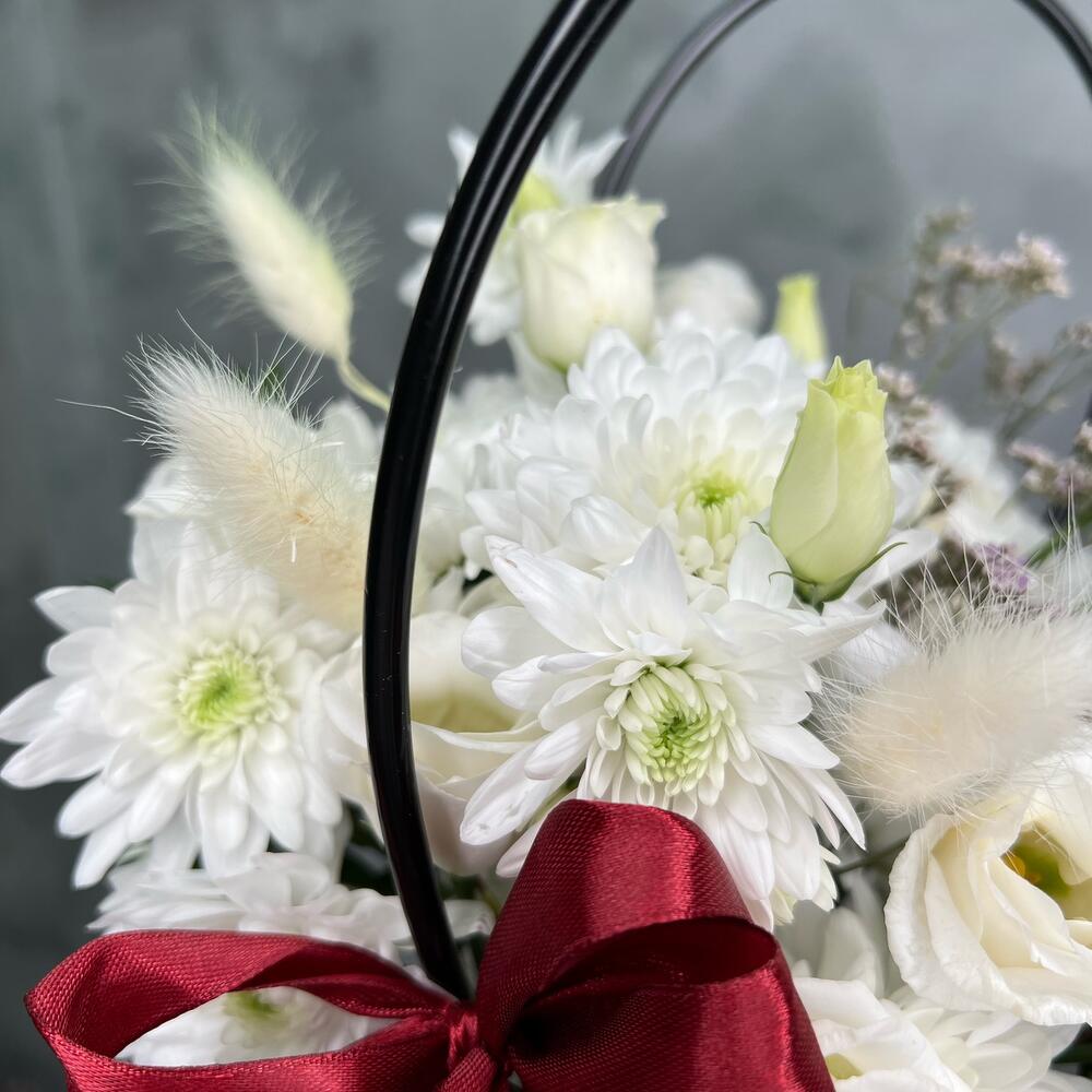 Хризантема кустовая – 2 шт.лизиантус(эустома) – 1 шт.лимониум(статица) – 1 шт.Фисташка – 1 шт.Лагурус (сухоцвет) – 3 шт.Оазис флористический – 1 шт.Сумка крафт – 1 шт.бант атласный – 1 шт.