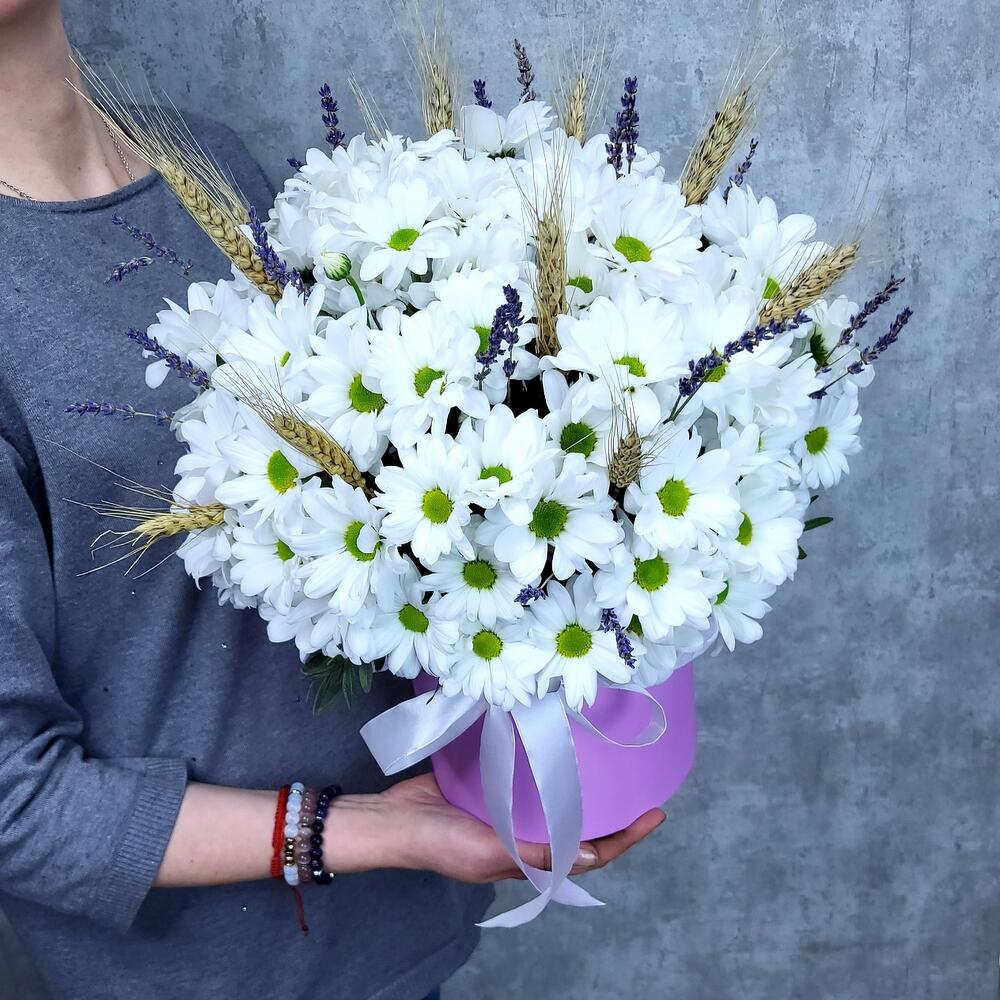 “Сиреневый туман” – композиция из гипсофилы в шляпной коробке