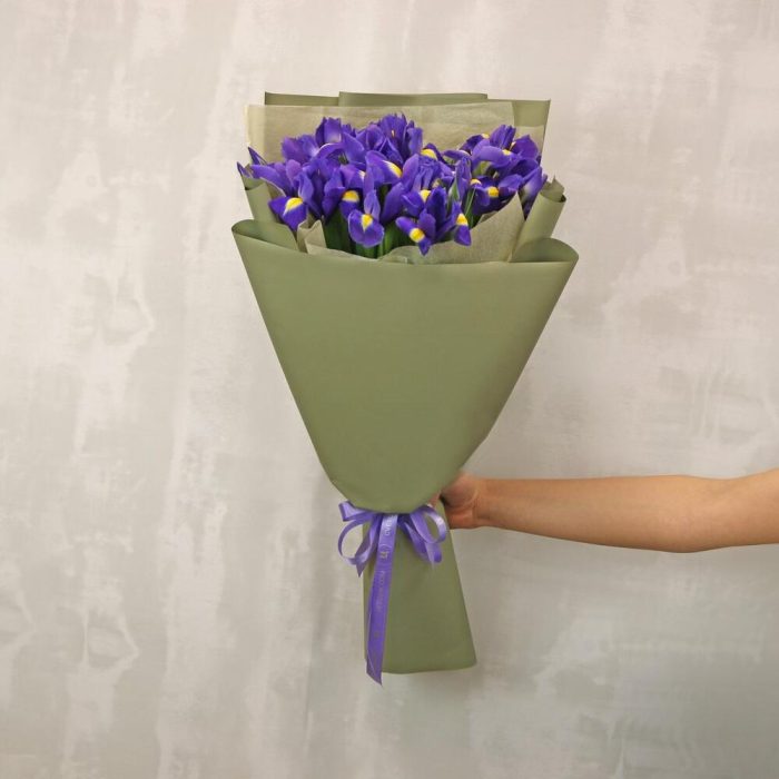 Букет из 25 синих ирисов в стильной упаковке
