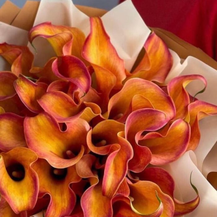 Калла оранжевая – 29 шт.Упаковка дизайнерская – 2 шт.Лента атласная – 2 шт.Открыточка с вашими пожеланиями – 1 шт.хорошее настроение – 100 шт.инструкция по уходу за цветами – 1 шт.коробка переноска – 1 шт.Кризал – 1 шт.