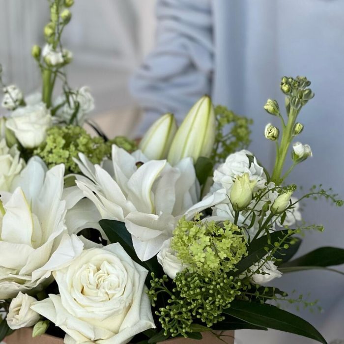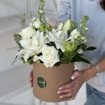 Вибурнум – 3 шт.Лизиантус – 4 шт.Маттиола – 2 шт.Шляпная коробка – 1 шт.Скиммия – 3 шт.Гринбелл – 2 шт.Оазис флористический – 1 шт.лилия дабл – 2 шт.