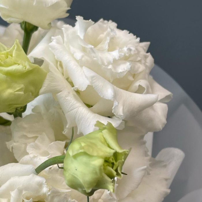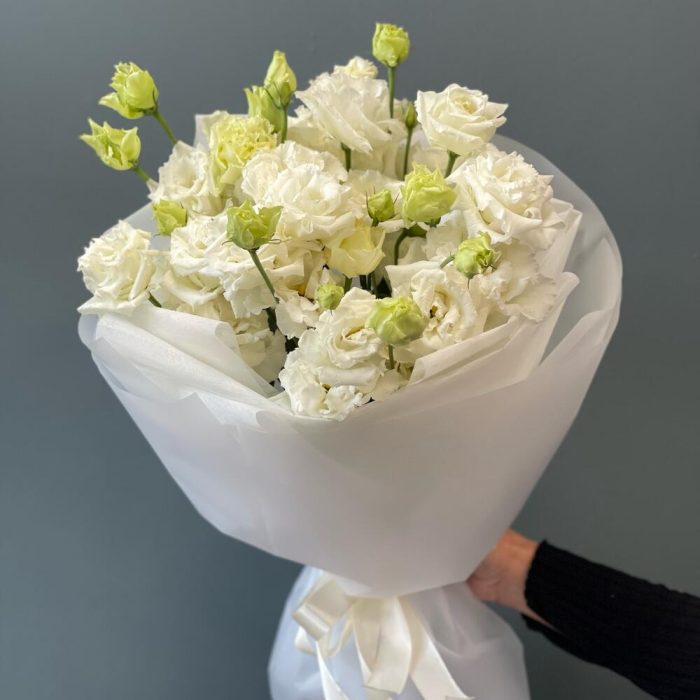 Лизиантус – 15 шт.Лента атласная – 1 шт.Тишью – 2 шт.Упаковка дизайнерская – 1 шт.