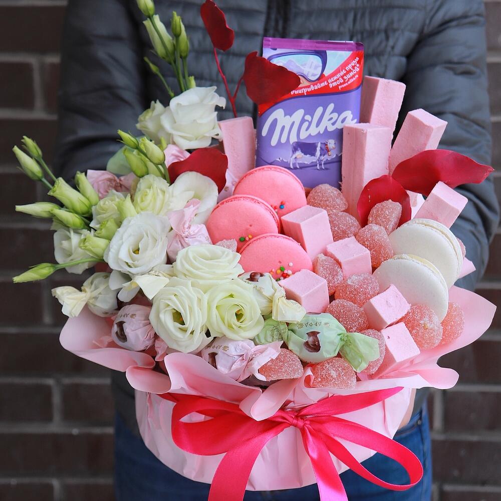 Эустома – 3 шт.Шоколад милка – 1 шт.Макарон – 5 шт.пастила упаковка – 1 шт.мармелад упаковка – 1 шт.Конфеты – 7 шт.Оазис – 1 шт.Декор элементы – 1 шт.Стильная упаковка – 1 шт.Прозрачная пленка – 1 шт.