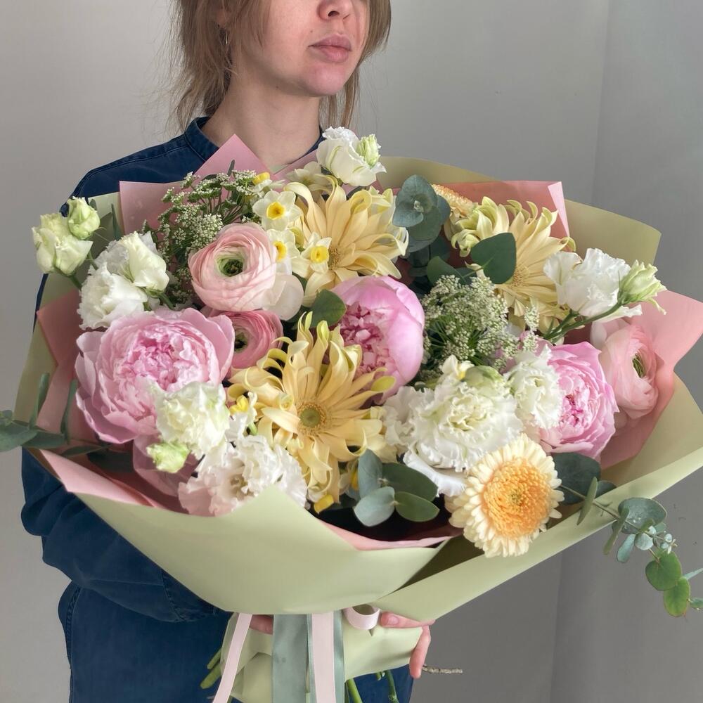 Пион – 3 шт.Ранункулюс – 3 шт.гербера кучерявая – 3 шт.Амми – 3 шт.Лизиантус – 3 шт.Нарцисс – 3 шт.Гербера мини – 3 шт.Эвкалипт – 6 шт.Упаковка – 1 шт.
