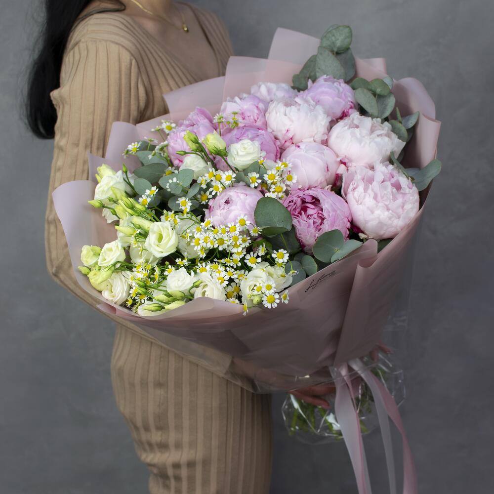 Матрикария – 7 шт.Лизиантус белый – 5 шт.Эвкалипт цинерея – 3 шт.пионы сара бернардт – 11 шт.