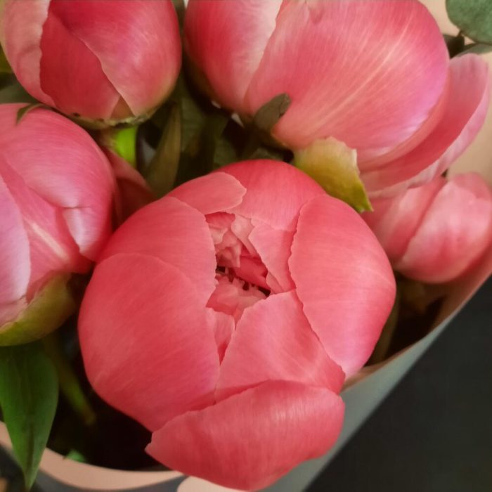 Букет из 7 коралловых пионов и ароматного эвкалипта в дизайнерской упаковке
