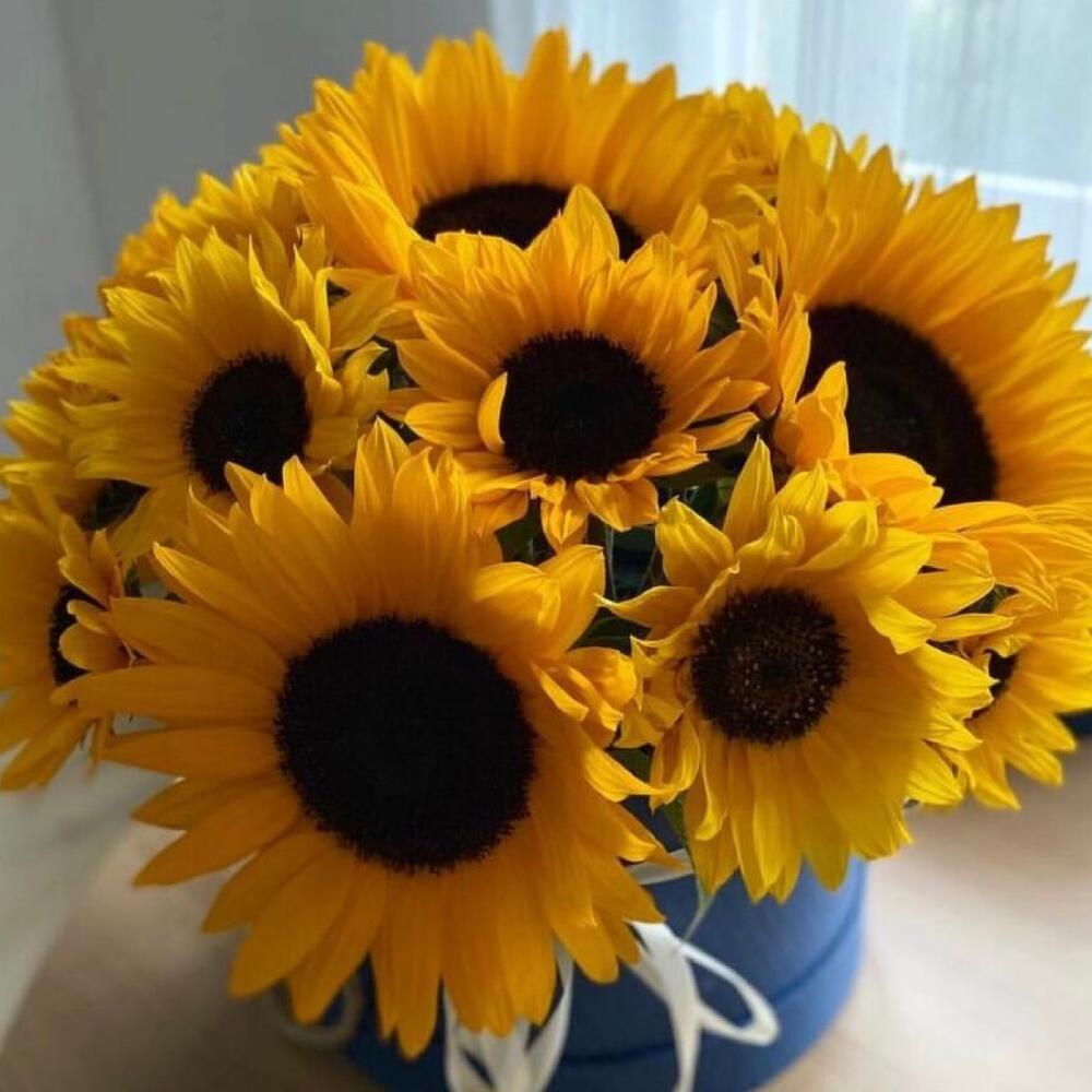 Цветочная композиция из 13 подсолнухов в шляпной коробке