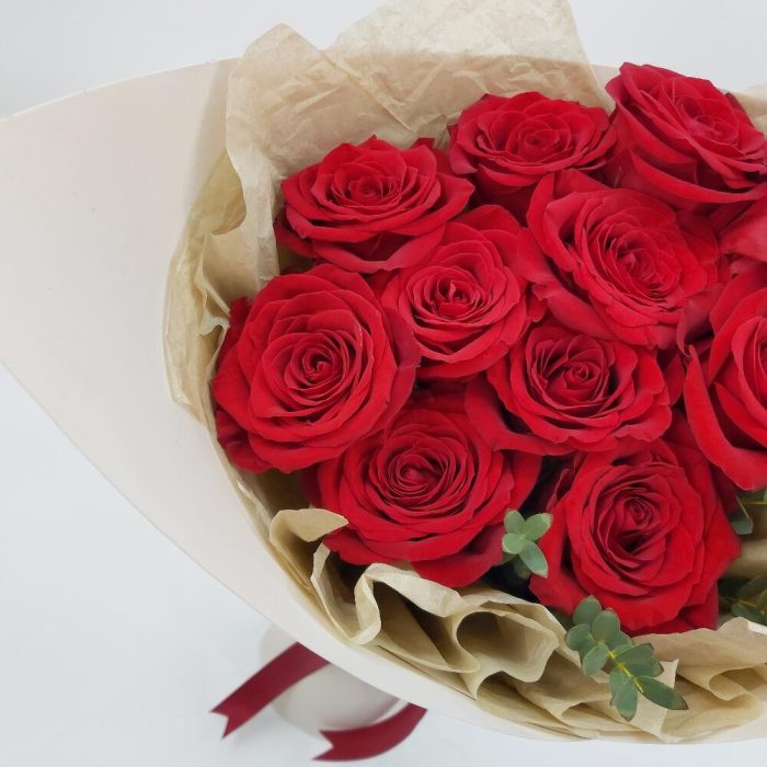 Эвкалипт – 1 шт.Роза Эквадор – 11 шт.Лента атласная – 1 шт.Упаковка тишью – 4 шт.Упаковка фоамиран – 2 шт.любовь флориста (бесплатно) – 1 шт.
