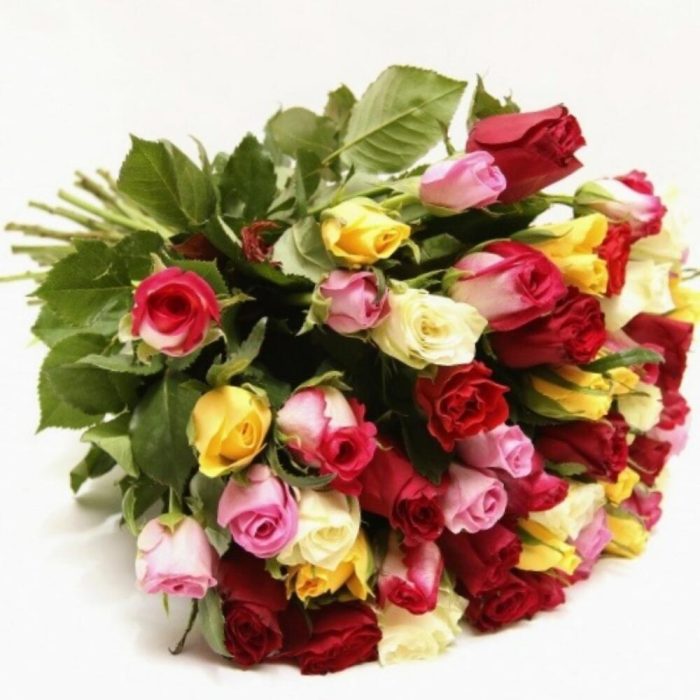 Лента атласная – 1 шт.Упаковка дизайнерская – 1 шт.роза микс – 51 шт.