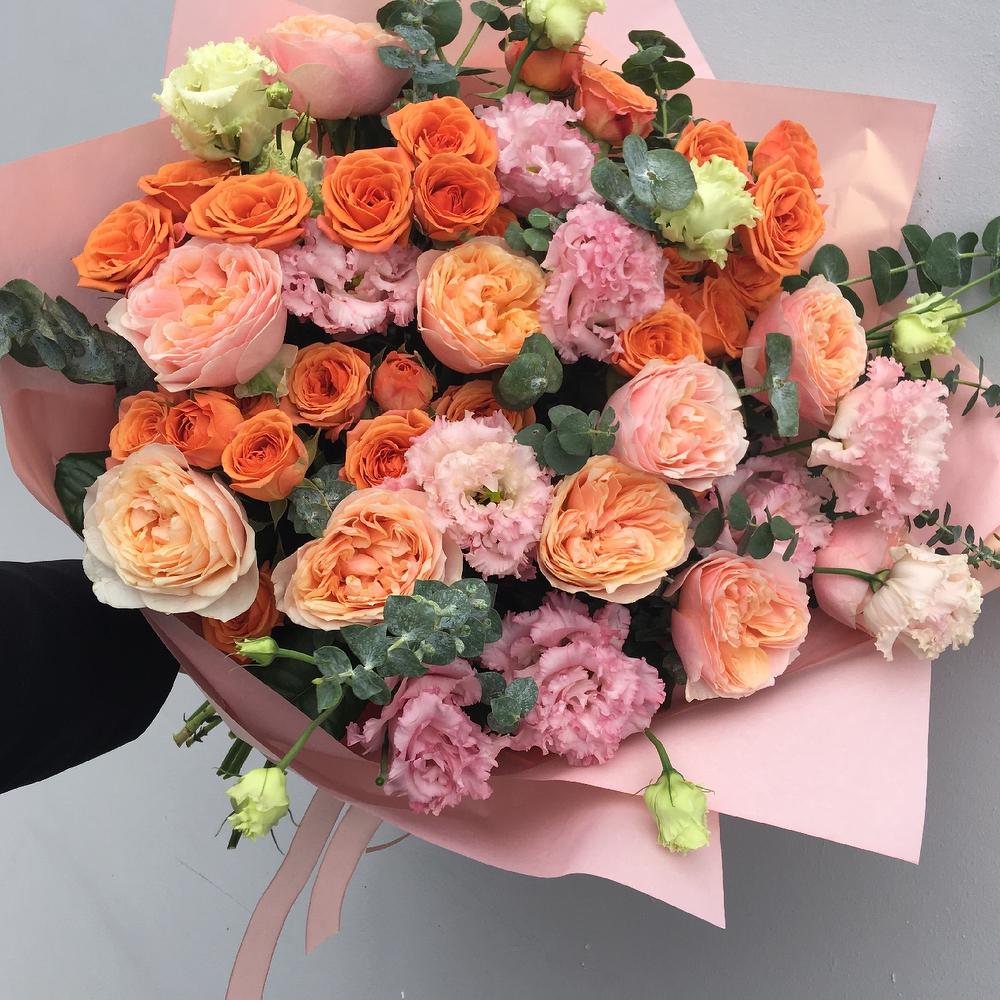 Роза пионовидная – 9 шт.Роза кустовая – 5 шт.Лизиантус – 9 шт.Эвкалипт – 9 шт.Упаковка – 3 шт.Лента атласная – 2 шт.