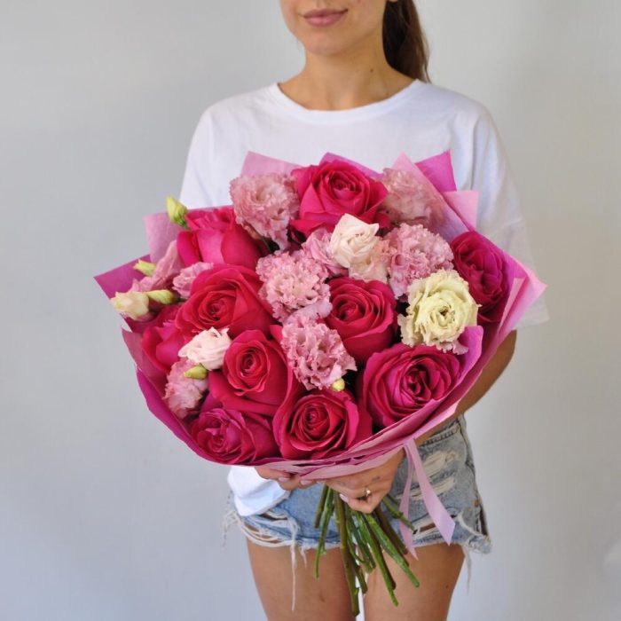 Лента атласная – 1 шт.эустома розовая махровая – 5 шт.роза Pink Floyd ароматная – 11 шт.упаковка жатая крафт бумага – 1 шт.