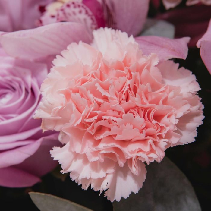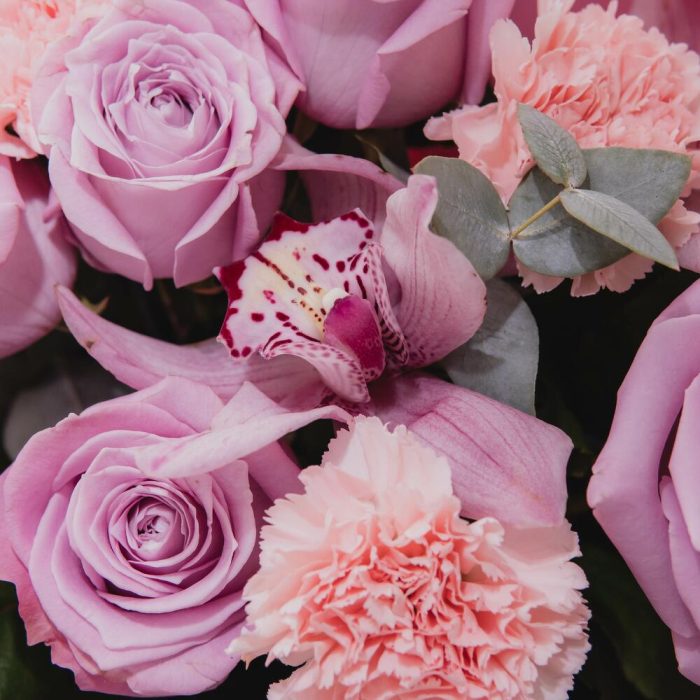 Авторский букет: орхидея розовая, диантус персиковый и роза розовая Маритим