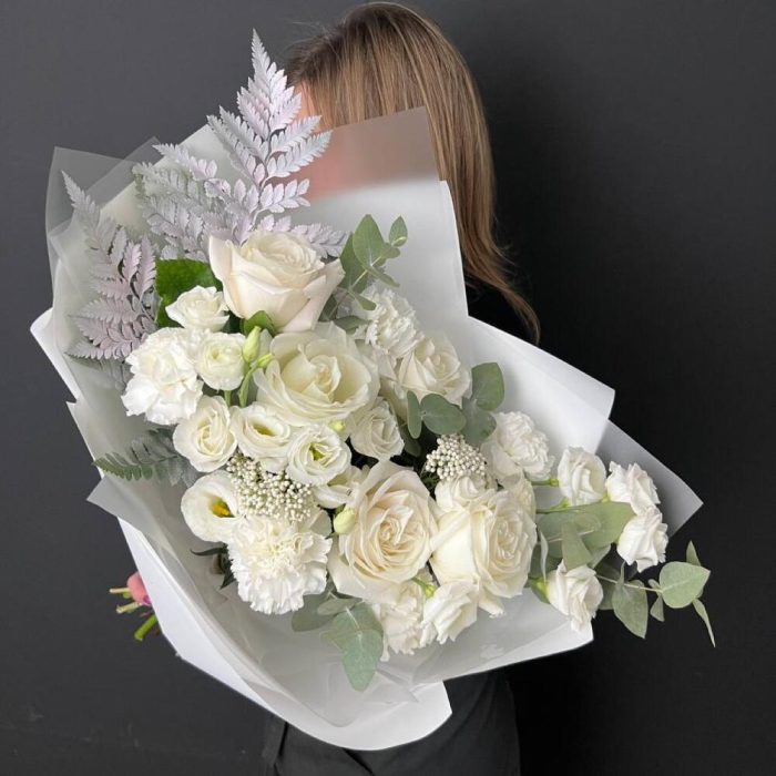 Белый букет с розами, ароматными маттиолами и эустомой