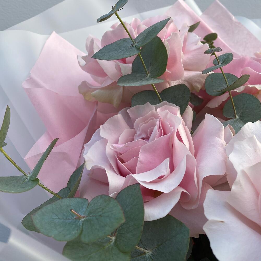 Эвкалипт – 1 шт.Тишью – 2 шт.Роза розовая – 7 шт.Пленка матовая – 1 шт.