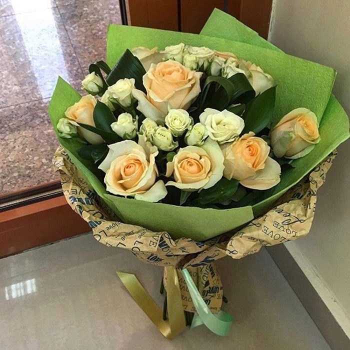 Лента – 1 шт. Зелень – 1 шт. Бумага – 1 шт. Роза кенийская 50 см – 11 шт. Роза кустовая местная 50 см – 3 шт. Газета – 1 шт.