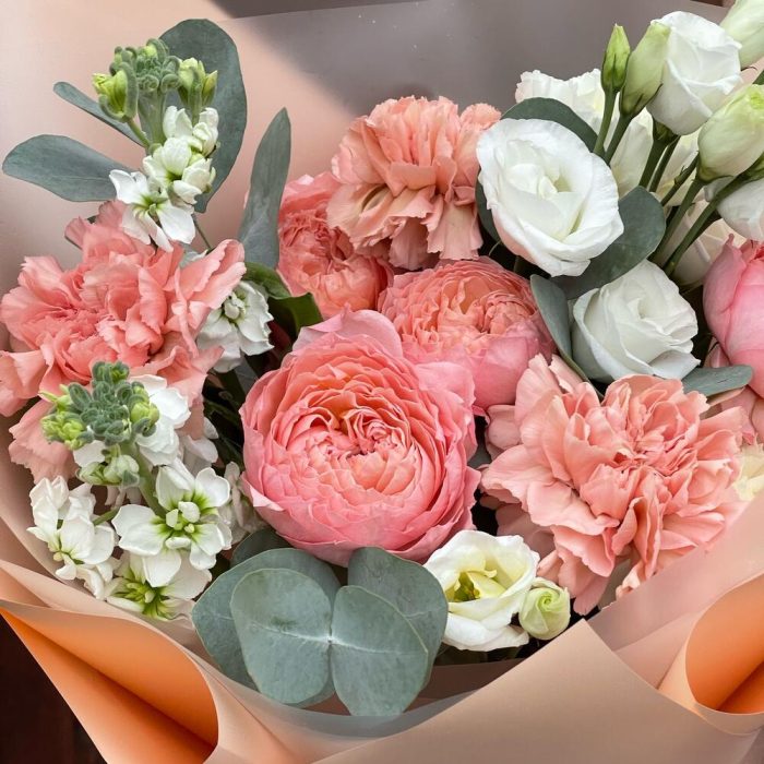 Роза кустовая пионовидная джульетта – 1 шт.Диантус – 5 шт.Маттиола – 2 шт.Эвкалипт – 1 шт.эустома розита вайт – 1 шт.Пленка матовая – 5 шт.Лента атласная – 2 шт.