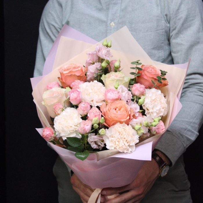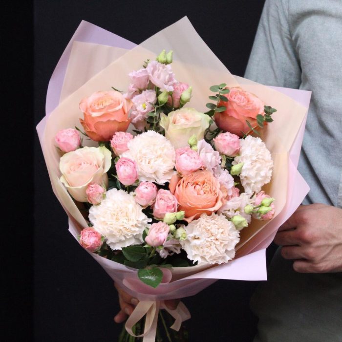 Роза пионовидная кахала – 3 шт.роза эквадор фруттето – 2 шт.Диантус – 4 шт.роза пионовидная кустовая мадам бомбастик – 3 шт.эустома махровая розовая – 2 шт.Эвкалипт – 2 шт.Пленка матовая – 3 шт.Лента атласная – 2 шт.