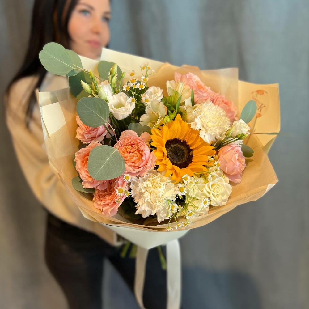 Пионовидная роза джульетта – 4 шт.Диантус – 3 шт.Эустома – 1 шт.Ромашка – 2 шт.Роза кустовая – 3 шт.подсолнух (гелиантус) – 1 шт.Эвкалипт – 2 шт.