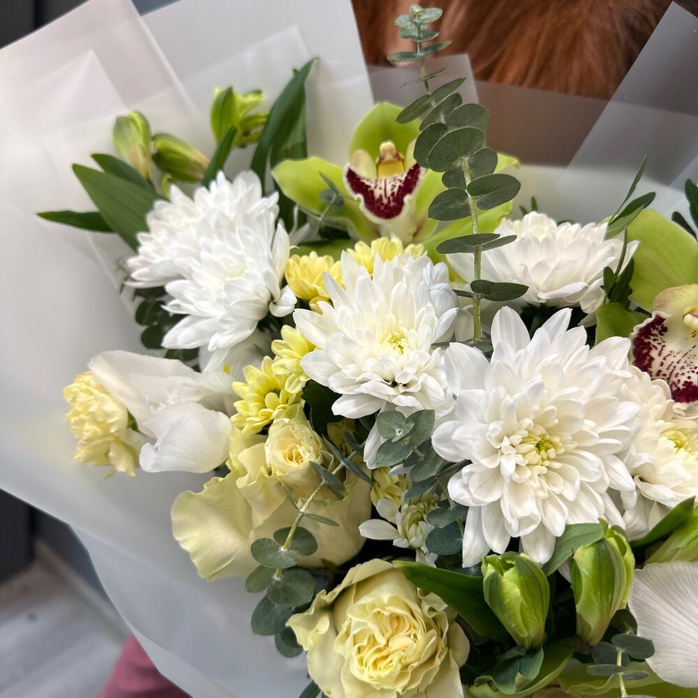Альстромерия – 3 шт.Хризантема кустовая – 2 шт.Эвкалипт – 3 шт.Роза – 3 шт.Лента атласная – 2 шт.Фисташка – 1 шт.орхидея – 2 шт.Упаковка дизайнерская – 2 шт.Диантус кустовой – 2 шт.саньини – 1 шт.