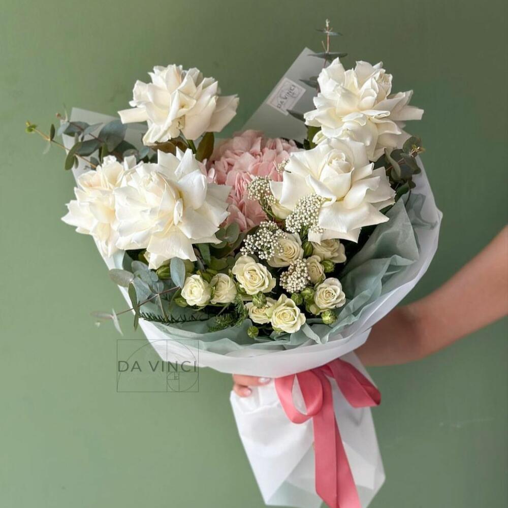 Букет “Chloe” из роз, гортензии и спрей роз
