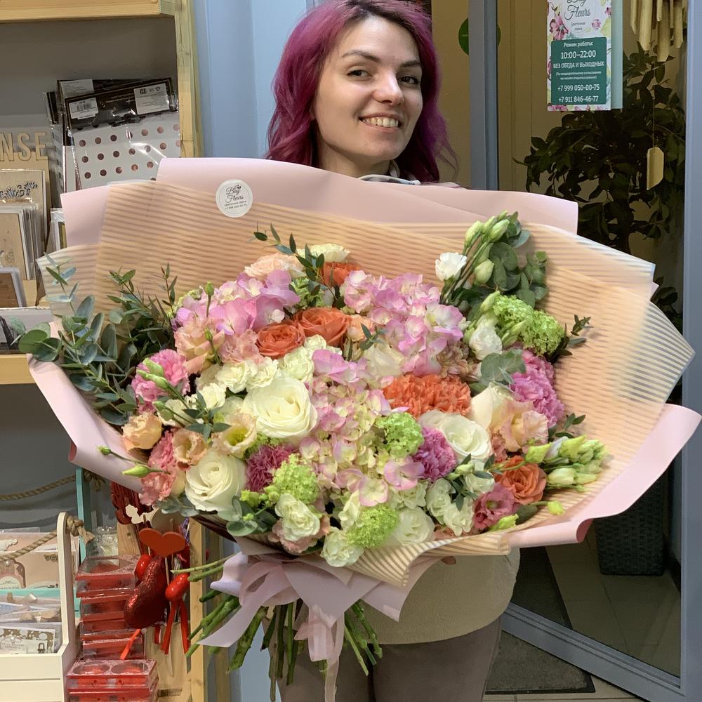 Роза пионовидная садовая – 5 шт.Гортензия – 2 шт.Роза кустовая пионовидная – 5 шт.Лизиантус алиса пинк – 3 шт.Гвоздика – 7 шт.Роза – 6 шт.Вибурнум – 3 шт.Эвкалипт – 3 шт.Упаковка дизайнерская – 1 шт.Лента атласная – 1 шт.