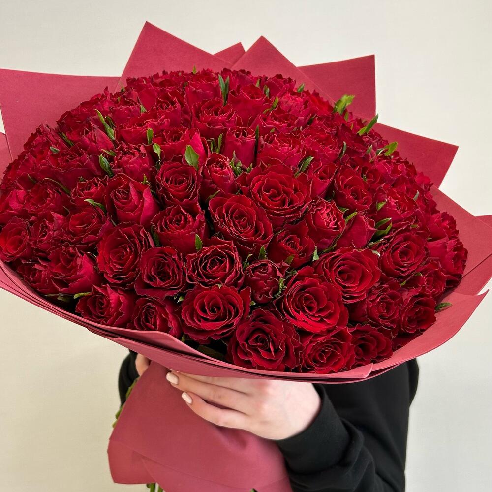 Роза – 101 шт.Лента атласная – 5 шт.Упаковка дизайнерская – 5 шт.