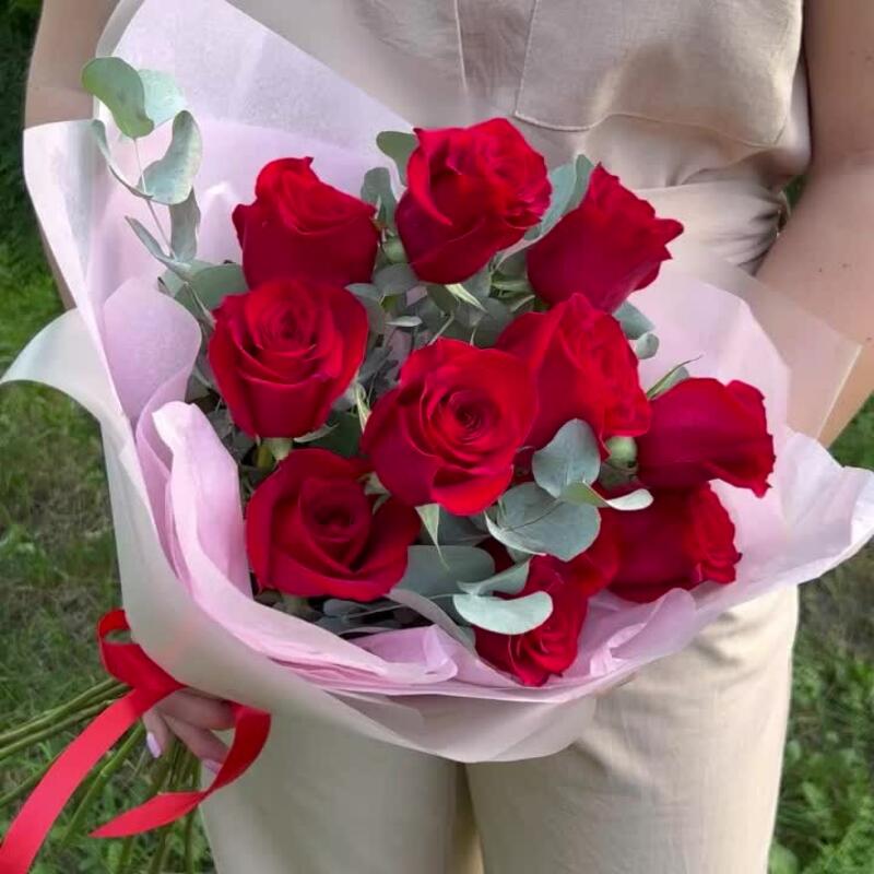 Роза фридом 50 см – 11 шт.Эвкалипт – 3 шт.Дизайнерская упаковка – 2 шт.