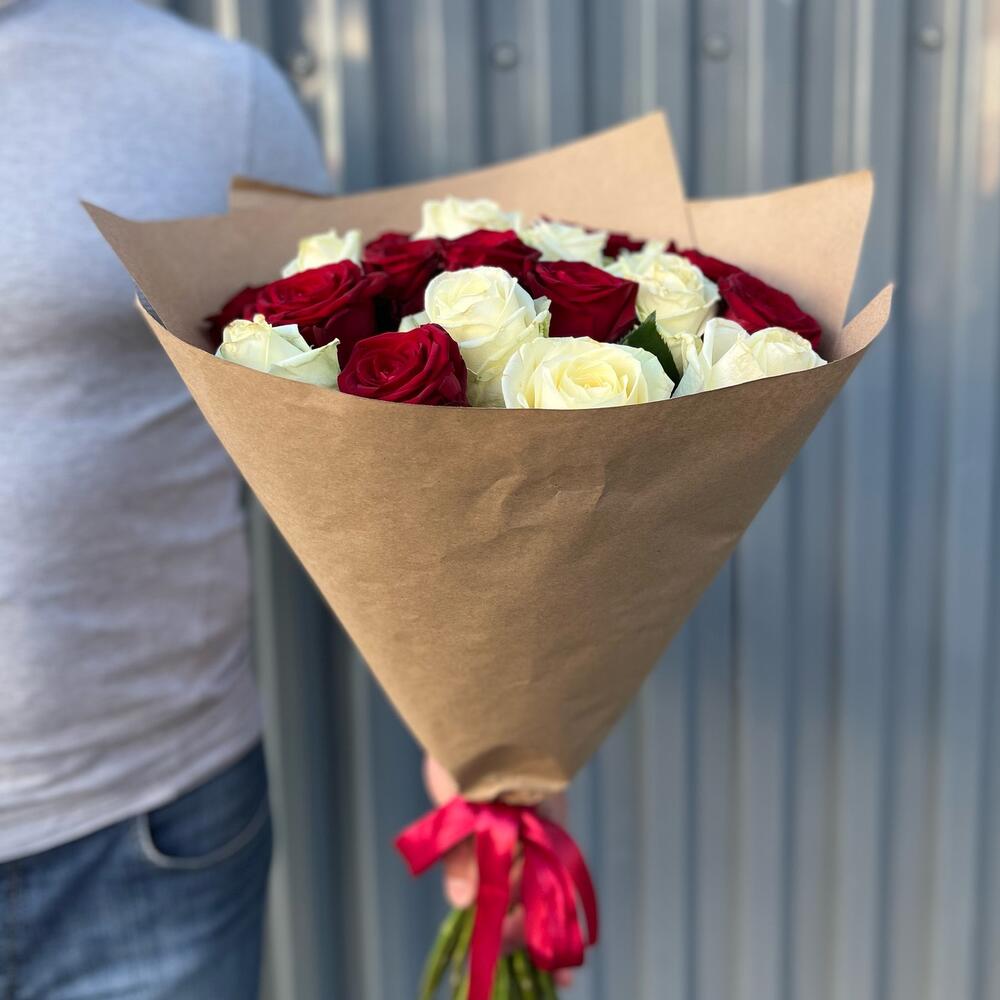 Роза красная 60 см – 11 шт.Крафт упаковка – 1 шт.Роза белая 60 см – 10 шт.