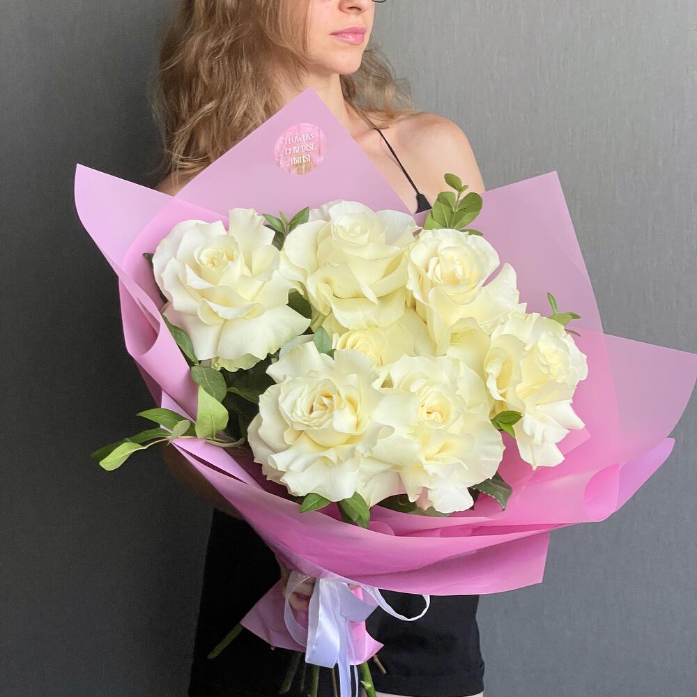 Упаковка – 1 шт. Атласная лента – 1 шт. Французская роза – 7 шт. флористическая зелень – 2 шт.