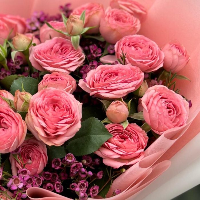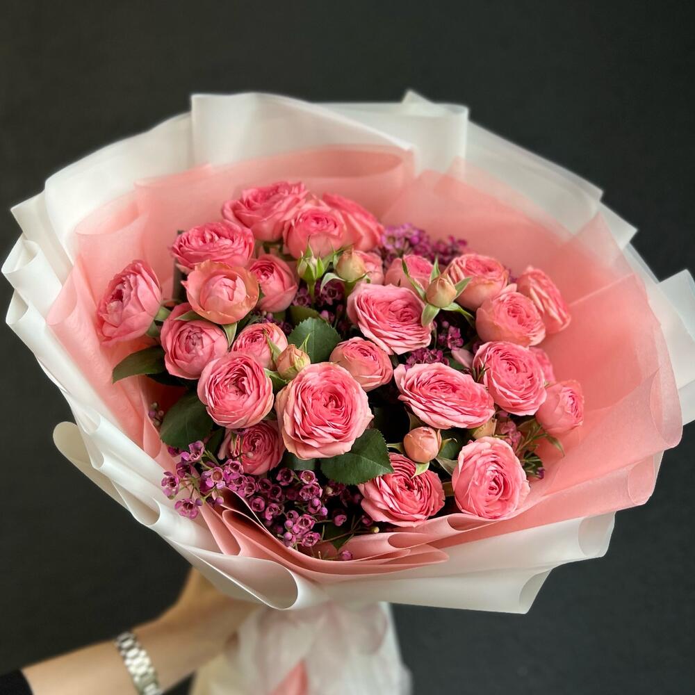 Кустовая пионовидная роза – 7 шт.Хамелациум – 3 шт.декоративная упаковка – 1 шт.Атласная лента – 1 шт.
