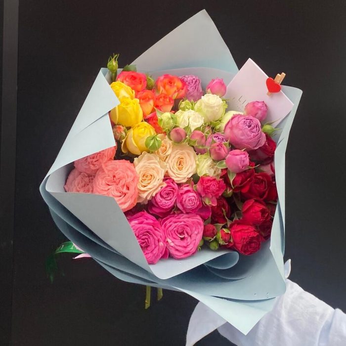 Упаковка дизайнерская – 3 шт. Пионовидная кустовая роза – 9 шт. Открыточка с вашими пожеланиями – 1 шт. инструкция по уходу за цветами – 1 шт.
