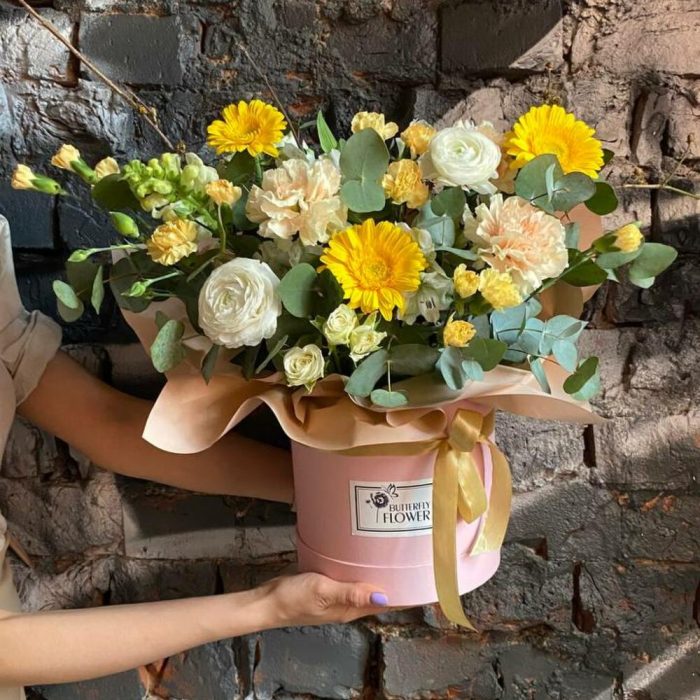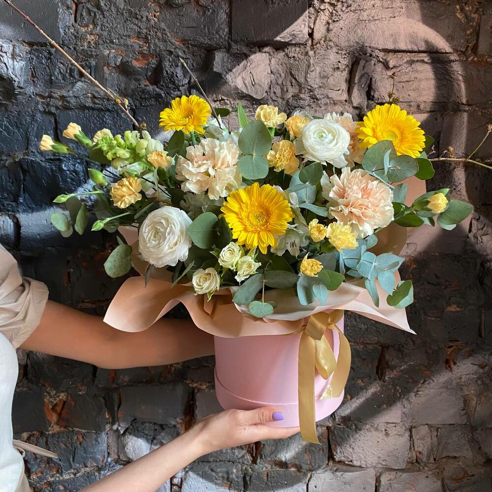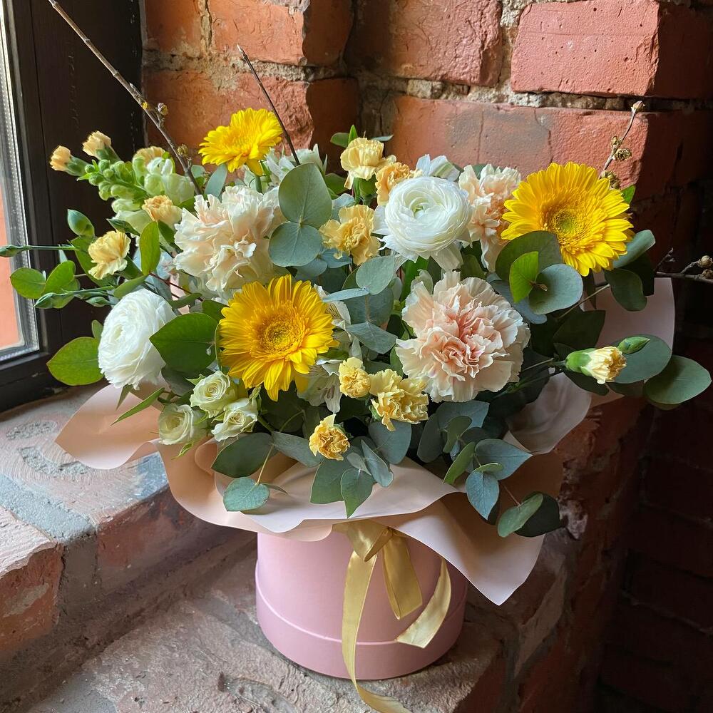 Букет из ранункулюсов, гвоздик, гербер, кустовых роз и эвкалипта в стильной шляпной коробке “Солнце Афин”