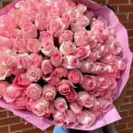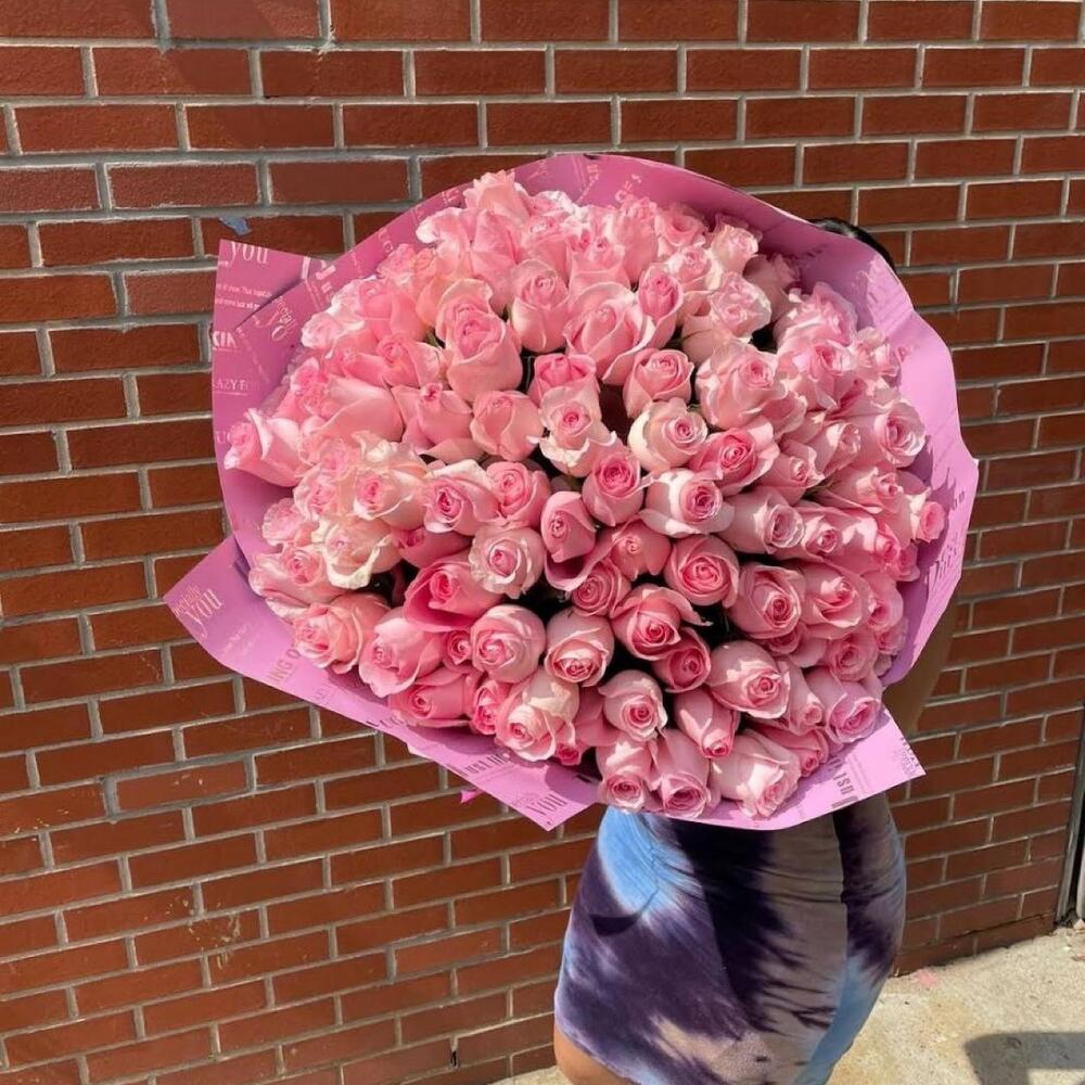 Роза розовая – 101 шт.Упаковка дизайнерская – 1 шт.Лента атласная – 2 шт.Открыточка с вашими пожеланиями – 1 шт.инструкция по уходу за цветами – 1 шт.хорошее настроение – 100 шт.коробка переноска – 1 шт.Кризал – 1 шт.