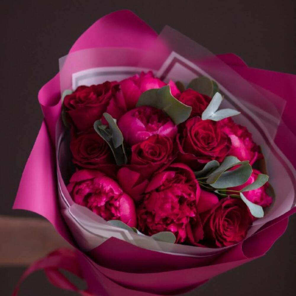 Атласная лента – 2 шт.Корейская пленка – 2 шт.пион red sharm – 5 шт.эвкалипт cinerea – 4 шт.кенийская красная роза 50 см – 6 шт.