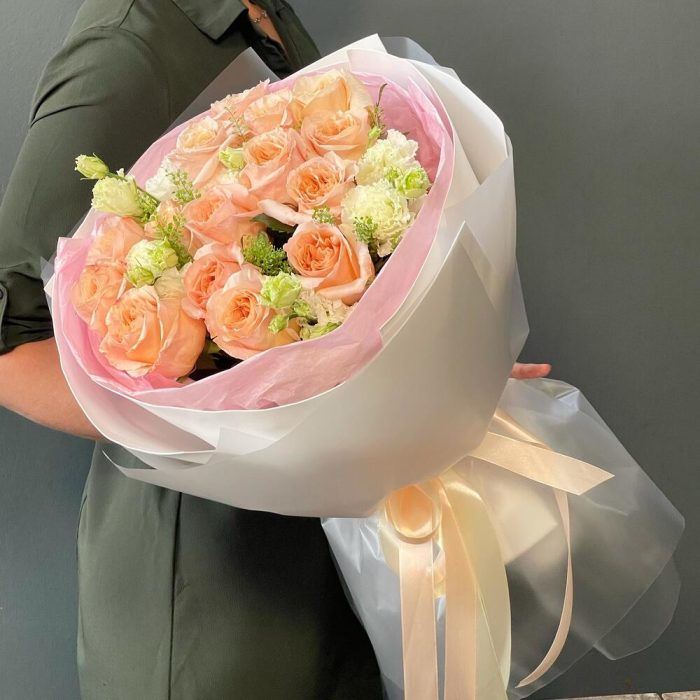 Букет с розами и лизиантусами “Завладевая чувствами”