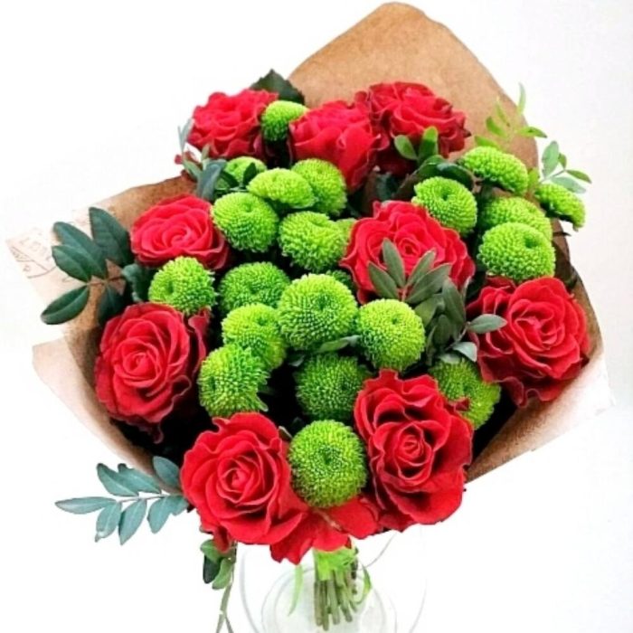 Состав: роза красная- 9 шт, хризантема зеленая- 4 шт, зелень фисташка- 2 ветки.