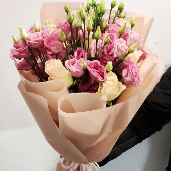 Состав: роза кремовая – 6 шт, эустома розовая- 5 веток.