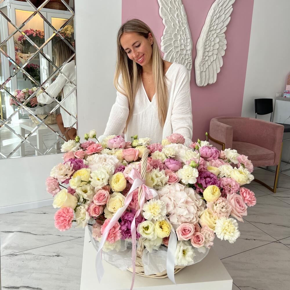 Гортензия – 3 шт.Пионовидная роза – 20 шт.Лизиантус – 10 шт.Диантус – 20 шт.Кустовая роза – 7 шт.Пион – 5 шт.Роза Эквадор – 10 шт.Корзина плетеная – 1 шт.Авторская упаковка – 2 шт.