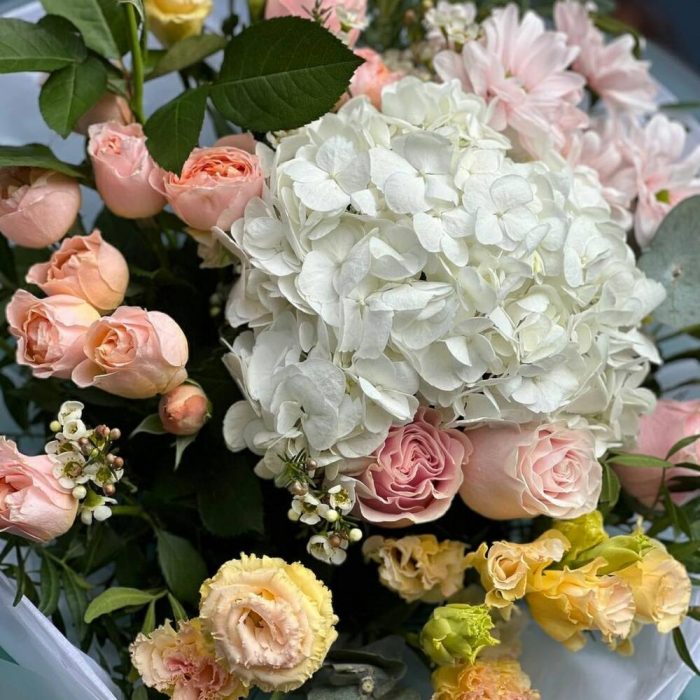 Гортензия – 1 шт. Лента – 1 шт. Хризантема кустовая – 1 шт. Эвкалипт – 3 шт. Эустома – 2 шт. Фисташка – 5 шт. Роза голландия – 3 шт. Упаковка дизайнерская – 7 шт. Роза пионовидная спрей – 3 шт.