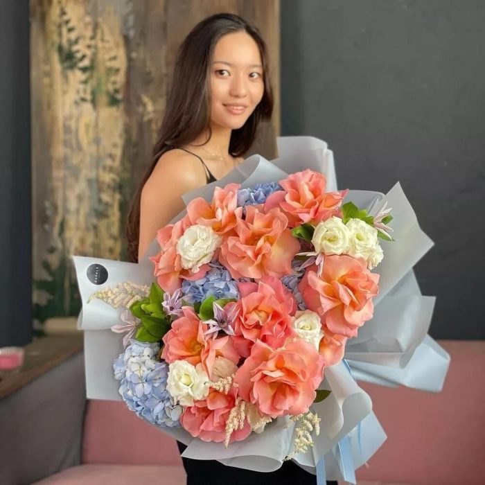Сборный букет "EURO 3.4" состоит из 11 голландских роз, 4 голландских гортензий, 4 астильб, 5 лизиантусов и 5 веток клематиса в оформлении. Букет безмолвно может сказать обо всех Ваших чувствах, оставив лишь приятные воспоминания у получательницы. Выбрав букет от RAFALE, Вы скрасите день обладательницы букета и подарите ей незабываемые эмоции.